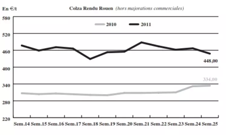 Les cours du colza sur le marché physique français reculent à nouveau, dans le sillage du complexe soja sur le marché à terme de Chicago. De bonnes conditions climatiques ont permis de terminer les semis de soja dans les temps, tandis que la qualité des cultures déjà en terre augmentait d’un point, selon le département américain à l’Agriculture. Cette tendance baissière est accentuée par le net repli du pétrole, qui rend le biodiesel moins attractif. Cependant, les fondamentaux demeurent haussiers, avec des prévisions de récolte mondiale en retrait. Dans l’UE à 27, les prévisions de production (19 Mt) sont loin de subvenir aux besoins estimés (24 Mt). La campagne 2011/2012 risque d’être tendue et les cours fermes. En tournesol, les cours renchérissent, alors que les perspectives de production sont en hausse, principalement grâce à la récolte russe qui est annoncée en croissance de 30 % (?), les productions d’Europe et d’Ukraine n’étant pas en reste. Le marché des oléagineux est en stand-by.