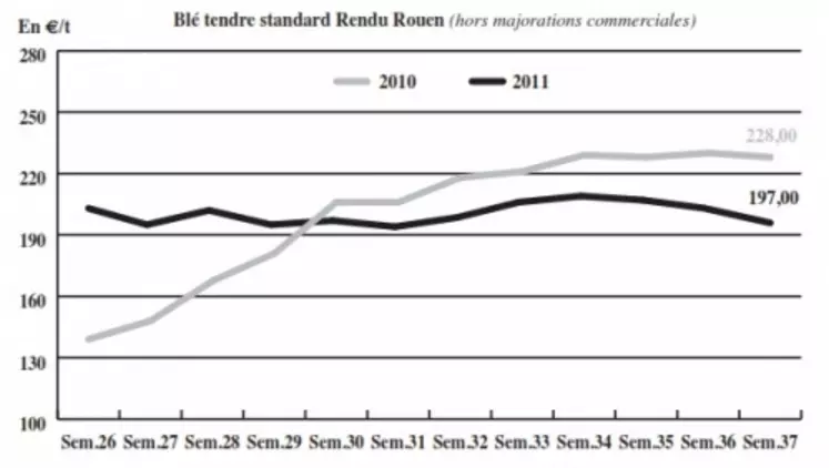 Les cours du blé tendre français ont nettement décroché cette semaine. Peu d’éléments existent actuellement pour redonner des ailes aux cotations, si ce n’est le rapport de l’USDA faisant état d’une dégradation des cultures de maïs US. L’offre en blé, européenne et mondiale, ayant été successivement corrigée à la hausse, conjuguée aux craintes que la dette de certains membres de l’UE fait peser sur les marchés financiers, a été à l’origine de la baisse de plusieurs euros constatée cette semaine sur les marchés européens. De plus, malgré le recul de l’euro, l’origine mer Noire, et plus particulièrement russe, concurrence trop vivement les productions de l’UE qui peinent toujours à s’imposer sur le marché international. Depuis mercredi dernier, la Jordanie a acheté 50.000 t de blé fourrager, sans précision concernant l’origine, et Taïwan 44.100 t de blé US. Seul le Maghreb continue de s’approvisionner en blé français. L’Algérie, notamment, a acheté 400.000 t de blé hexagonal. La demande portuaire reste donc soutenue compte tenu du débouché précité et de demande d’Etats membres de l’UE. Sur le marché intérieur, les fabricants d’aliments du bétail achètent des lots pour des livraisons rapprochées tandis que les opérateurs de la meunerie parient sur une baisse et se montrent peu actifs, d’autant que sur le rapproché, leurs besoins sont bien couverts. On note une demande pour certains blés en variété pure afin de corriger les mélanges, la qualité n’étant vraissemblablement pas une caractéristique de la récolte de blé tendre 2011.
