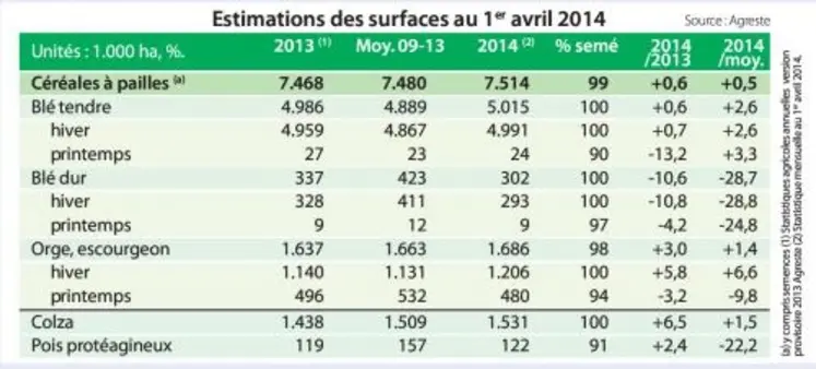 L'automne et l'hiver ont été doux et humides, perturbant les semis de blé tendre à l'automne et retardant les semis de printemps. En 2014, la sole de blé tendre croît légèrement, à 5 Mha. Les surfaces d'orge s'étendent à 1,7 Mha. La remontée pour la deuxième année consécutive de la sole d'orge d'hiver compense la baisse de celle d'orge de printemps. Les surfaces de blé dur poursuivent leur recul initié l'an dernier, et, avec 300.000 ha, s'alignent sur celle de la fin des années 1990. Avec 1,5 Mha, la sole de colza repart à la hausse, après le point bas de 2013.