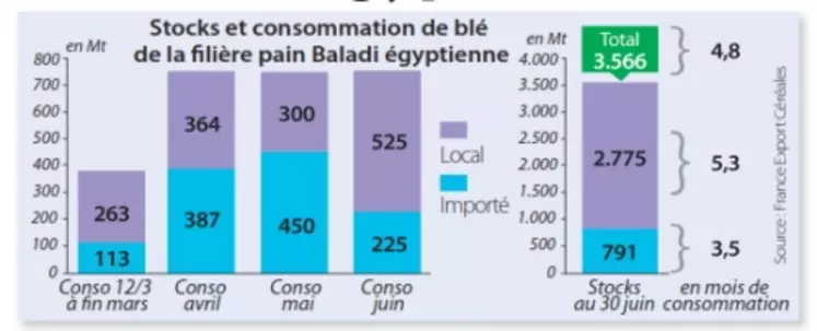 En se basant sur les stocks du pays au 12 mars 2013, une consommation mensuelle de 750.000 t, les livraisons avril/mai et le début de la récolte 2013, France Export Céréales estime que les stocks restant au 30 juin sont de 3,57 Mt dont 791.000 t de blé importé et 2,78 Mt de blé local. Cela correspondrait à 4,8 mois de consommation. Mais le stock de blé importé au 30 juin ne constituerait, lui, que 3,5 mois de consommation. Et selon certains proches du Gasc, ce chiffre serait plus proche de 2 mois. Cela rendrait « impératif le lancement d’appels d’offres pour le blé importé. C’est d’ailleurs ce qui s’est passé le 1er juillet au soir », avec une demande de 180.000 t de blé. L’appel a été remporté par la Roumanie (120.000t ) et l’Ukraine (60.000 t).