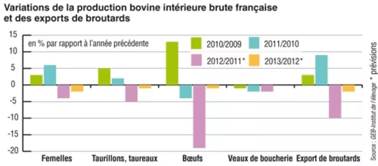 La production bovine française atteindrait 1,574 million de têtes cette année, soit 5 % de moins que l’an dernier, selon l’Institut de l’élevage. La production de femelles devrait ainsi reculer de 4 % cette année. Le cheptel laitier se replie depuis plusieurs années, ce qui explique la baisse du nombre de femelles laitières abattues. Du côté des allaitantes, si les réformes ont été très fortes l’an dernier du fait de la sécheresse, elles ont été limitées cette année, d’autant plus que le cheptel est en recul de 2 %. La production de taurillons se replierait quant à elle de 5 %, après des années 2011 et 2010 en croissance. L’an prochain, l’Institut de l’élevage estime que notre production pourrait de nouveau baisser de l’ordre de 2 %. Ce repli atteindrait 3 % pour les femelles et 1 % pour les taurillons.