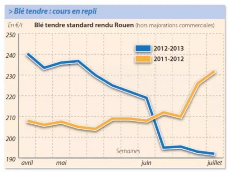 L’activité est réduite à son niveau minimal, avec des opérateurs dans l’attente du démarrage des moissons. Les incertitudes relatives à l’impact des pluies sur la qualité restent la grance inconnue. Dans le sud de la France, quelques premières coupes ont été réalisées. Qualité et rendements sont pour le moment au rendez-vous. La pression maladie reste importante. Et l’on aura un véritable démarrage la semaine prochaine sur la façade Atlantique et la Bourgogne. Dans le Nord-Est, la récolte de blé devrait débuter fin juillet-début août. Les prix se sont repliés durant la semaine dans la perspective d’importantes disponibilités de maïs sur le marché mondial. L’arrivée des blés américains pèse aussi sur les cours. Cela a relancé l’intérêt des pays importateurs. L’égypte a d’ailleurs commandé 120.000 t à la Roumanie et 60.000 t à l’Ukraine. Le fait que l’origine française, handicapée par le retard des moissons, n’ait pas été retenue dans cette appel d’offres a alimenté le recul des cours. La Chine a, elle, acheté 300.000 t de blé australien alors que ses cultures se dégradent. La bonne demande mondiale a entraîné une consolidation des prix ponctuelle sur Chicago. Notons aussi que l’USDA abaissé de 3 % son estimation des stocks mondiaux, à 19,5 Mt (20,2 Mt en juin 2012), dans son rapport publié le 29 juin.