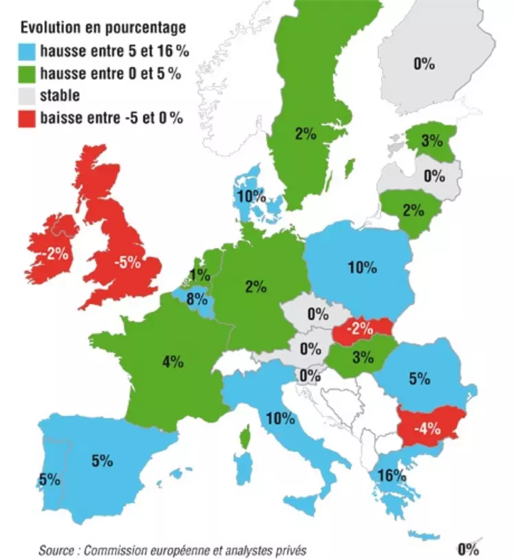 En France, la surface dédiée au blé pourrait progresser de 2 %, à près de 5 Mha d’après les premières estimations d’ensemencements établies par FranceAgriMer. Dans l’ouest de l’Hexagone, la culture cède cependant du terrain (-7,5 % pour les Pays-de-Loire, -5 % pour le Poitou-Charente). A l’Est en revanche, la sole serait en nette hausse, avec +40 % en Alsace, +37 % en Lorraine et +7 % en Bourgogne/Franche-Comté. Il est important de rappeler que l’étendue des cultures avait été affectée en 2012 par les retournements opérés après la vague de froid de février.