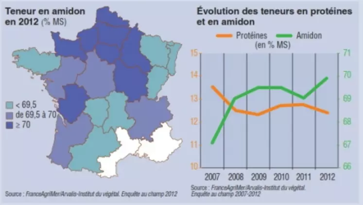 La richesse en amidon des blés évolue inversement aux taux protéique, souligne le document d’Arvalis-Institut du végétal et de FranceAgriMer. À 12,4 %, la teneur moyenne en protéines, ramenée à la matière sèche, recule quelque peu par rapport à 2011 et est inférieure de 0,3 point à la moyenne quinquennale. Quelque 61 % des blés passent la barre des 12 % MS. La moyenne chute à 11,9 %MS dans certaines régions, et notamment en Poitou-Charentes. À l’inverse, elles culminent à 13,5 %MS dans la région de l’Auvergne.