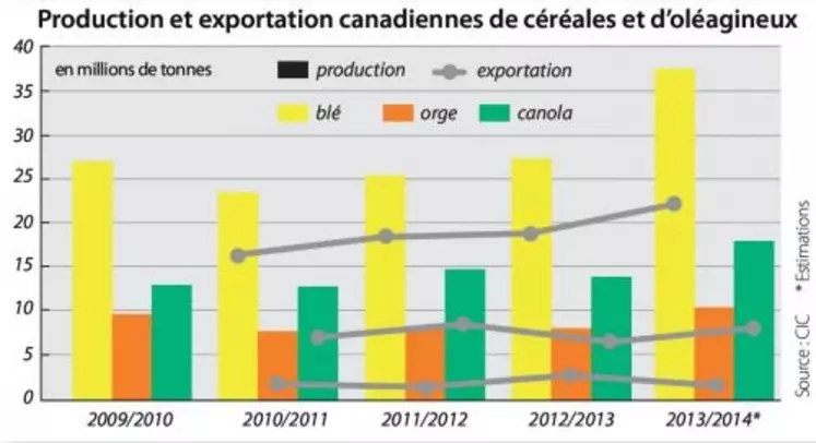 Les récoltes de céréales et d'oléagineux au Canada ont dépassé toutes les attentes en 2013/2014, selon le Conseil international des céréales (CIC). La production, toutes céréales confondues, est estimée à 66,2 Mt, en hausse de 28 % sur l'an dernier, y compris une augmentation de 38 % pour le blé à 37,5 Mt, alors que la récolte de canola fait 29 % de plus à 18 Mt. Toutefois, l'acheminement des exportations, notamment aux ports du Pacifique, est entravé par une logistique précaire, et l'on s'attend à une progression sensible des niveaux de stocks d'ici à la fin de la campagne. Les stocks de blé, au 31 décembre, étaient estimés à 28,4 Mt (+37,7 % par rapport à 2012), selon Statcan. Ceux de canola s'affichaient à 12,6 Mt (+55,3 %). Si le CIC mise sur une croissance des exportations de céréales et de canola en 2013/2014, de respectivement 1,4 Mt et 1,2 Mt, les résultats seront sans doute plafonnés par des problèmes logistiques dans le transport de gros volumes par voie ferrée. La capacité du réseau est limitée et les exportateurs doivent faire concurrence non seulement à d'autres céréales, mais aussi à d'autres marchandises en vrac, comme le pétrole, le charbon, le sable et les minerais. Un temps extrêmement froid vient encore exacerber le problème.