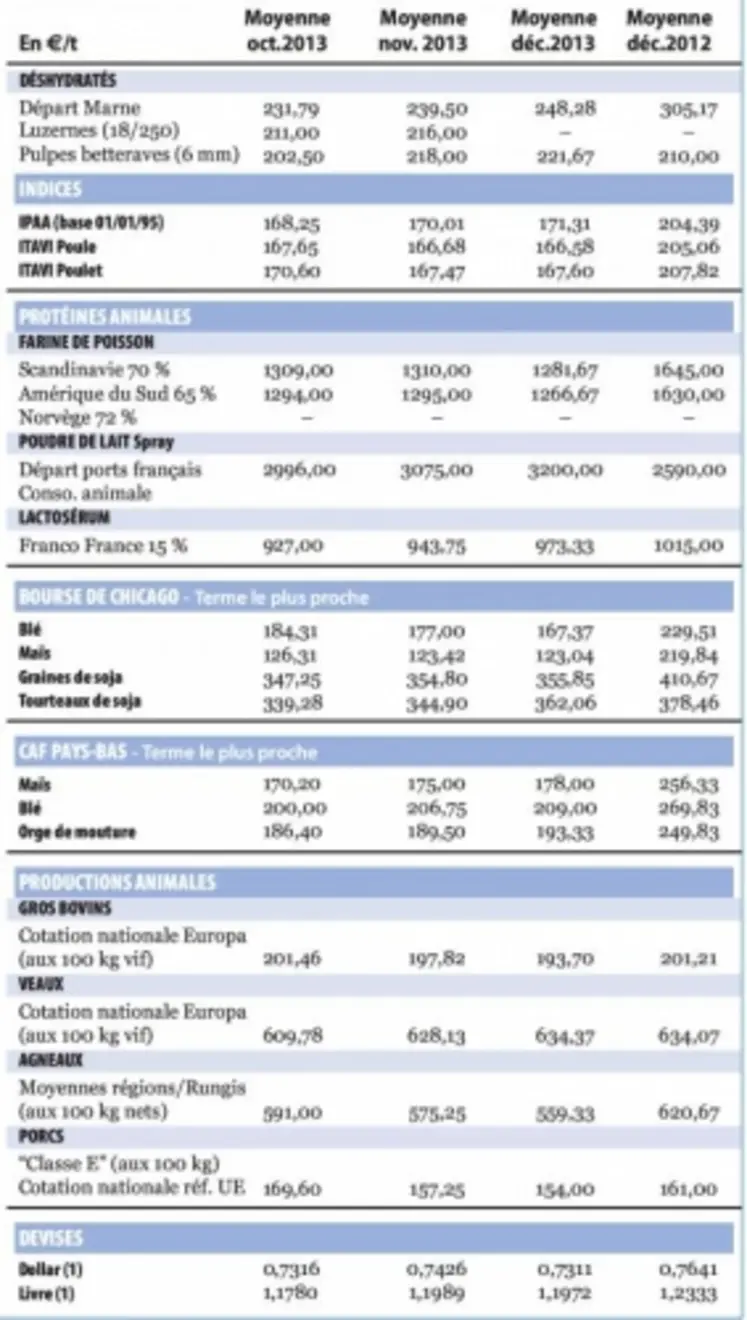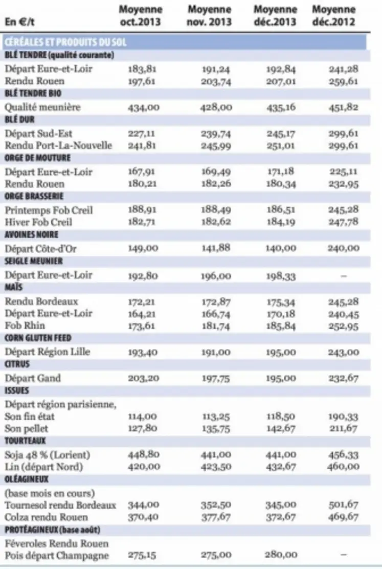 Nos lecteurs trouveront ci-après, pour les principaux produits, la moyenne mensuelle des cours relevés en décembre 2013 et, à titre de comparaison, les moyennes d'octobre et novembre 2013, et, il y a un an, celles de décembre 2012. Pour les céréales, moyennes mensuelles des cotations hebdomadaires relevées chaque jeudi (majorations commerciales de décembre 2013 comprises). Pour les productions animales, moyennes mensuelles des cours relevés par FranceAgri-Mer et pondération nationale des cotations porcs.