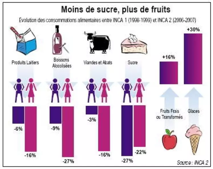 Du côté du plat principal, dans l'assiette des Français et surtout des Françaises, la place de la viande et des abats s'est rétrécie en huit ans, avec respectivement une baisse de 16% et 3% (chez les adultes, le recul étant de 19% pour les enfants). Une place récupérée en partie par les garnitures, tels que le riz qui bondit de 20%. Du côté des desserts, les changements s'avèrent également sensibles. Alors que la consommation de sucres et dérivés recule, l'INCA 2 note une explosion de la consommation des glaces et crèmes glacées (+30% chez les adultes) et une progression notable de celle des fruits frais ou transformés (+16% chez les adultes, +12 chez les 15-17 ans mais une stabilité chez les 3-14 ans). Malgré ces progrès, l'étude nutritionnelle montre qu'en 2006 encore plus d'un tiers des Français était en dessous des 5 fruits et légumes par jour.