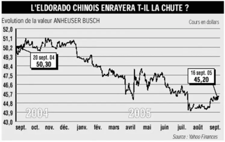 Ultra majoritaire sur son marché et premier brasseur mondial, le groupe américain Anheuser Busch n’en rencontre pas moins des difficultés. Balloté en bourse ou son cours est en chute depuis un an, le propriétaire de la marque Budweiser (créée en 1876) a été épinglé par le broker Bear Stearns, qui lui reproche de ne pas suivre les lignes stratégiques pourtant décidées par le groupe. Côté facade, le management d’Anheuser, par la voix de son dirigeant August Busch IV, s’est fixé comme première priorité d’élever l’image de la bière, de remotiver les consommateurs et de faire globalement plus pour vendre ses produits. Mais dans la réalité, Anheuser Busch n’aurait pas la même approche du terrain, avec des pratiques discount destinées à atteindre coûte que coûte les objectifs de volumes et croissance. La faute à un marché américain en très faible progression (101,8 millions de barils en 2002, 102,6 en 2003 et 103 en 2004), qui ne suit pas encore la tendance baissière enregistrée en Europe mais semble en prendre le chemin. Possédant une activité emballages aluminium (et plus étonnant une branche parcs d’attraction), Anheuser Busch réalise les trois quarts de son activité de vente sur le sol américain (pour un chiffre d’affaires de 14,9 Mds $ en 2004. Pour se regonfler le moral et le portefeuille, le groupe a investi en Chine depuis plusieurs années, un marché courtisé par toutes les grandes marques avec un potentiel de développement important (5% de croissance annuelle). Rachetés ou engagés dans des partenariats avec les brasseurs étrangers, les opérateurs chinois participent à la concentration du secteur. Mais que l’on ne s’y trompe pas, la poule aux œufs d’or n’est pas encore en mesure de modifier le visage du géant américain. La tendance n’est cependant pas au désengagement pour les propriétaires de titres. Depuis plusieurs mois, les analystes restent attentistes, mais prônent dans leur majorité pour la conservation des actions Anheuser-Busch.