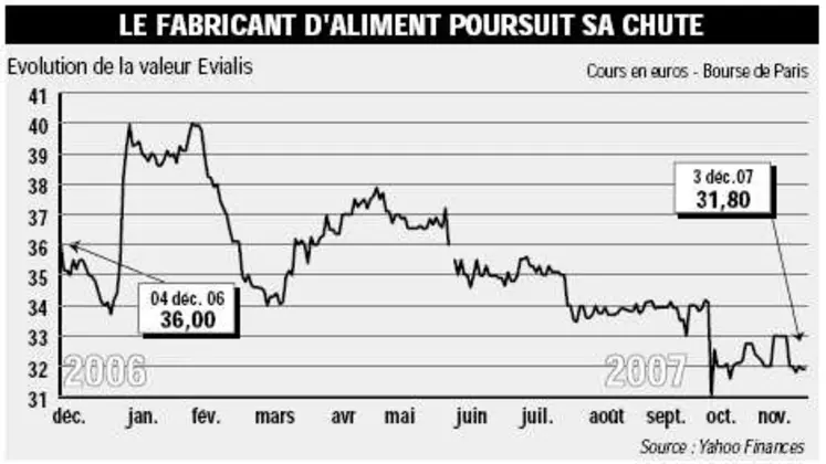 Dans un contexte toujours tendu de prix pour les céréales, le groupe de nutrition animale Evialis continue de souffrir. Il y a peu, la publication des résultats du 3 e trimestre a révélé une progression des ventes de 19,6% (soit 185 millions d'euros). Sur les 9 premiers mois de l'année la hausse a atteint 13,8%, aidée en partie par les nouvelles acquisitions réalisées au cours de 2007 (Rossovit en Russie, Trouw Nutrition France, Zoofort au Brésil). Mais la société a déclaré qu' « au vu de l'activité enregistrée sur les 9 premiers mois, le groupe maintient son objectif d'un résultat net annuel au même niveau que celui de l'année précédente ». Il devrait donc s'élever à environ 3,9 millions d'euros, un chiffre divisé par deux en comparaison de 2005. La progression globale du chiffre d'affaires compense donc la baisse des marges, un facteur important dans la mesure ou les hausses de prix des intrants « n'ont pu être que partiellement répercutées dans le prix de vente aux éleveurs et distributeurs ». En bourse, l'incertitude sur le prix des matières premières continue de handicaper Evialis, déjà en baisse sur 2006. La valeur suit aujourd'hui le même chemin malgré un sursaut d'orgueil en février. En zoomant sur son activité récente, Evialis entrevoit des évolutions plutôt positives, notamment dans la vente d'aliment complet en France, première activité du groupe. Ce segment a bien résisté, principalement grâce à un effet prix, les importantes augmentations de tarifs sur la période « permettant ainsi de redresser les marges ». Dans le secteur des premix, les nouvelles implantations industrielles en Roumanie et en Chine devraient accélérer ces développements sur le premier trimestre 2008 tandis qu'une dynamique de développement a été retrouvée dans le domaine de la santé avec des hausses (lactose, antibiotique, etc.) répercutées dans les prix de vente.