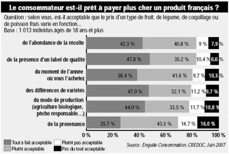Si les garanties d'hygiène et de sécurité restent toujours le premier critère d'achat des produits alimentaires, la compétitivité du prix, en deuxième position, progresse de plus en plus. A la question, « ces derniers mois est-ce que vous comparez les prix entre commerces ? », la proportion d'enquêtés qui répond « plus que d'habitude » est passée de 24 % en 2005 à 34 % en 2007. Et dans ce contexte de focalisation sur les prix, l'attention se concentre particulièrement sur les fruits et légumes. Alors qu'en 2005, 69 % des Français déclaraient systématiquement regarder les prix des fruits et légumes, ils sont aujourd'hui 73 %, contre 68 % pour les viandes et la charcuterie, 55 % pour le lait, les œufs et le fromage et seulement 21 % par exemple pour les produits pour bébé ou enfant.