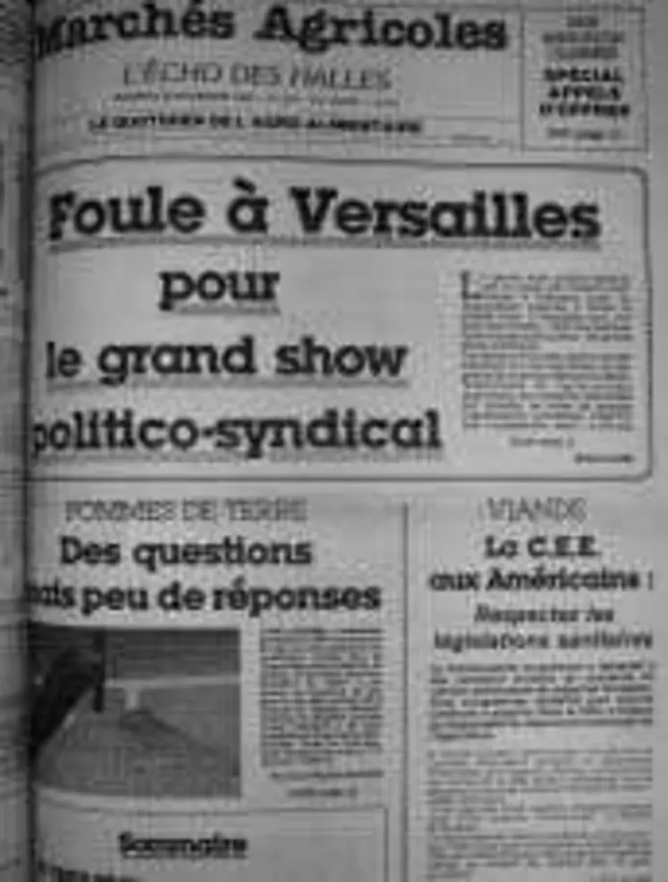 "Le grand show politico-syndical mis au point par François Guillaume, le Monsieur Loyal du syndicalisme agricole, a drainé la grande foule à Versailles pour voir les grands ténors politiques dans leur numéro « moi, la paysannerie, je connais et je soutiens ». Tout yeux et tout ouïes, mais un sourire sceptique au coin des lèvres, les dirigeants de toutes les fédérations départementales du syndicalisme majoritaire, des syndicats spécialisés par produits, de toutes les grandes organisations n’ont pas voulu perdre une parole ni un geste de ces spécialistes du grand spectacle que sont MM. Marchais, Jospin, Giscard d’Estaing et Chirac. Au départ, François Guillaume avait tracé le cadre. Pour les orateurs : 30 minutes pour chacun, pas d’évocation du passé, quelques lignes pour le présent, mais surtout un discours axé sur l’avenir de l’agriculture et sur les moyens que chacun veut lui donner. Pour les congressistes : des applaudissements neutres, éventuellement nourris mais égaux pour chacun des invités. C’est d’abord M.Lionel Jospin, premier secrétaire du Parti socialiste, qui a pris la parole. On attendait surtout son point de vue. Après avoir brodé sur l’importance de l’apport du monde agricole, il a tenté de faire l’apologie de ce que la majorité gouvernementale avait réalisé pour l’agriculture « étant certain qu’aucun orateur qui le suivrait ne le ferait pour lui » : les MCM (montants compensatoires monétaires, Ndlr), le chèque britannique, l’élargissement, les offices par filière, les améliorations sociales, le droit à la retraite à 60 ans… A l’occasion, il a remercié sans ironie les agriculteurs de la part qu’ils ont prise à la modération de l’inflation. Puis M. Marchais est venu s’exclamer : « Nous voulons donner à la France une agriculture forte et puissante, afin que ceux qui vivent du travail de la terre puissent en vivre dignement ». Pour leur part, MM.Chirac et Giscard d’Estaing ont caressé la FNSEA dans le sens du poil, reprenant la majorité de ses propositions et concluant sur la nécessité d’une démocratie participative n’acceptant ni trop d’État, ni trop peu d’État.