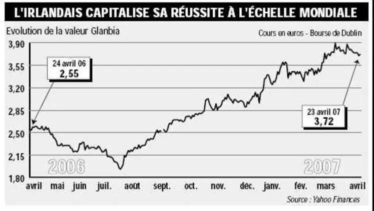 Rien d’étonnant à ce que les voyants soient au vert lorsque l’on est irlandais. C’est précisément le cas pour la firme Glanbia, qui commercialise du lait, des produits laitiers frais et de la viande. Le groupe a dévoilé récemment des résultats 2006 en hausse de 8 %, pour atteindre 2,1 Mds Eur, et a d’ores et déjà annoncé la couleur pour les années à venir. Glanbia ambitionne de devenir un fournisseur clé d’ingrédients et de solutions nutritionnelles, un segment qui lui apporte déjà 58 % de ses revenus et présente de bonnes perspectives. Malgré une légère baisse des ventes dans ce domaine (fromages ingrédients, beurre, caséines), le profit s’est amélioré. La fabrication d’ingrédients est le relais de croissance de Glanbia qui a racheté en octobre dernier l’américain Seltzer pour 105 M Eur. Le fournisseur d’ingrédients qui dégage de fortes marges possède des débouchés intéressants dans le domaine des céréales ou des boissons. Son intégration entre de plain-pied dans la stratégie de Glanbia, dont 40 % de l’activité s’exerce dorénavant à l’international. La part du marché des biens de consommation (28 % des ventes) a certes progressé de 3,5 %, mais au détriment d’une sévère chute des profits de 10 % en ce qui concerne les produits laitiers, fromages, boissons ou viande de porc. L’agribusiness, avec les fertilisants et autres intrants réussis bien à Glanbia (14 % de l’activité, en hausse de 15 % sur un an). Cette année, le géant irlandais va investir 50 M Eur hors éventuelles acquisitions. Le développement des ingrédients doit participer à la progression de la marge (4,4 % en 2005, 4,6 % en 2006) fixée à 5 % en 2008. Sur son sol, Glanbia a décidé d’améliorer la compétitivité des installations, et n’a pas peur de la concurrence. Titulaire de la marque Yoplait en Irlande, la firme vient de remporter un procès intenté par Danone, qui considérait que la gamme Yoplait Essence (produits laitiers à boire contre la prise de poids, pour renforcer l’immunité…) était trop proche sémantiquement de son yaourt Essensis.