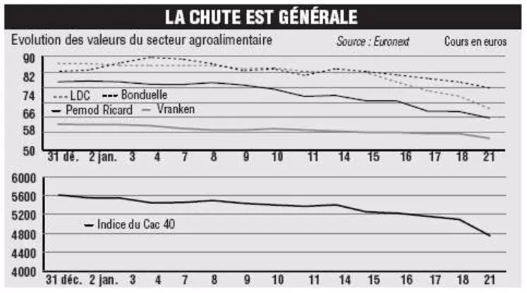 Brossard, dont le titre a perdu 40% de sa valeur depuis le début de l'année (dont 25 lundi), fait presque figure d'affaire. LDC, qui possède du cash, une forte structure financière et une marge stable, est également de nature à attirer les regards. D'autant que Sébastien Faijean, en contact avec de nombreux dirigeants, constate que « dans l'économie réelle, on ne ressent pas de ralentissement de l'activité. Les premières publications de résultats en 2008 pourraient donner lela ». La chute des bourses a un autre effet moins visible, mais intéressant s'il se poursuit : elle calme les ardeurs des spéculateurs sur les matières premières. Les prix du soja, du sucre ou du blé accusent des reculs de 3% à 4%. Les contrats maïs à échéance mars ont perdu 4%, la plus grosse baisse depuis octobre.