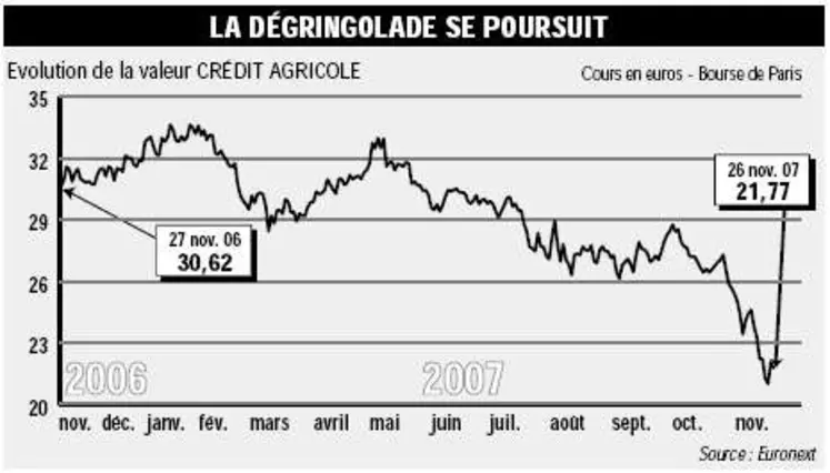 Partenaire financier n° 1 des industries agroalimentaires françaises, le Crédit Agricole n'affiche pas son meilleur état de forme. Le groupe bancaire présidé par le savoyard René Carron a certes fait état sur les 9 premiers mois de l'année d'un produit net bancaire de 14,36 Mds Eur (+20%) et d'un résultat net part du groupe de 4,9 Mds Eur (+29%), mais ce dernier indicateur accuse une forte baisse au troisième trimestre. De juillet à septembre, il s'établit à 954 millions d'euros, soit -16,8 %. À cela s'ajoute la valorisation boursière qui n'en finit plus de dégringoler, dans le sillage des difficultés liées à la crise des subprimes. À cet effet, le Crédit Agricole a provisionné 546 millions d'euros en vue des possibles dépréciations d'actifs, un montant conséquent auquel viennent s'ajouter des pertes de 347 millions de dollars liées aux erreurs d'un trader new-yorkais. Ces facteurs ont entraîné le titre aux alentours de 22 euros, un niveau que le Crédit Agricole n'avait plus atteint depuis plus de deux ans. Pour ajouter au marasme ambiant, le groupe bancaire qui a réparti son activité en trois tiers, entre la banque d'investissement (Calyon), la banque de détail (notamment le Crédit Agricole et le Crédit Lyonnais) et les services (assurance vie, crédit à la consommation, etc.) vient de renforcer sa position dans le groupe Bankinter, une manœuvre qui a tout de suite été sanctionnée par les bureaux d'analyse. Ces derniers estiment le coût de l'opération disproportionné, et sont nombreux à avoir dégradé leurs recommandations. Lehman Brothers est ainsi passé de « surpondérer » à « pondération en ligne » avec un objectif de cours à 27 euros, tandis que le Crédit Agricole a été retiré de la liste européenne des valeurs à l'achat de Goldman Sachs. De son côté, Crédit Suisse a abaissé sa recommandation de « neutre » à « sous performer » avec un objectif de cours réduit de 25 % à 23 euros.