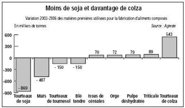 L'industrie a laissé de côté 900 000 tonnes de tourteau de soja, le remplaçant en partie par 600 000 tonnes de tourteaux de colza. Les cheptels avicole et porcin sont de grands consommateurs de tourteau de soja. Étant en régression, il est normal qu'ils en consomment moins. La substitution opérée entre le soja et le colza a surtout concerné les ruminants. Ces espèces tolèrent bien la moindre concentration protéique et la richesse en fibres du colza. Et il se trouve que leur consommation d'aliments composés a progressé de 4,4 à 4,8 millions de tonnes entre 2003 et 2006.