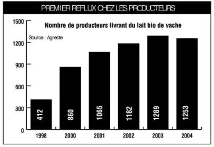En 2004, près de la moitié de la collecte bio (47 %) a été réorientée vers la filière conventionnelle, une proportion qui atteignait déjà 39 % en 2003. « Hormis les laits conditionnés et les fromages de chèvre, toutes les fabrications biologiques reculent » indique l'étude Agreste. Comme quoi les produits transformés s'accommodent assez mal du label AB. « La baisse atteint 28 % pour les desserts lactés, 20 % pour la crème conditionnée, 15 % pour les yaourts et laits fermentés, et 10 % pour les fromages à base de lait de vache ».