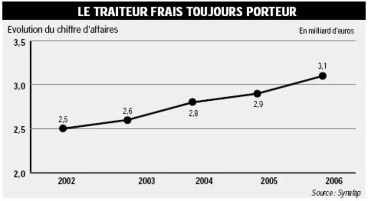 Le marché du traiteur en France n'est pas encore arrivé à maturité. Sur les cinq dernières années, les ventes de produits traiteur frais ont progressé de 25 % en tonnage et 19 % en valeur. Entre 2005 et 2006, les ventes se sont encore améliorées de 8 % en tonnage pour atteindre 679 000 tonnes et de 5 % en valeur à 3,1 milliards d'euros.