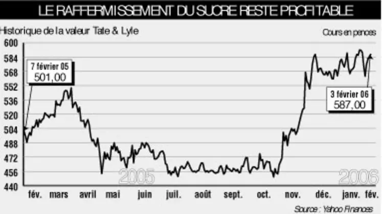 Caché (au grand dam des nutritionnistes) ou visible au grand jour, le sucre est rarement absent des produits alimentaires. C’est grâce à cette omniprésence que le groupe Tate & Lyle a construit sa renommée et sa croissance, en y ajoutant une pincée de technologie. Le Britannique, qui a réalisé au premier semestre 2005/2006 des ventes de 2,7 Mds Eur (+12 %), possède dans son portefeuille le sucralose, édulcorant star de ces dernières années. Commercialisé sous le nom de Splenda, il se retrouve dans les boissons, confiseries et autres produits. Cet additif au fort pouvoir sucrant est d’ailleurs la principale source de profit du groupe : représentant 4 % des ventes, il dégage 22 % des profits totaux. À l’inverse, les sucres vendus au grand public ne sont pas très rémunérateurs. Avec 46 % des ventes totales de Tate & Lyle, ils ne génèrent que 24 % des profits. La pression sur les prix et les coûts supplémentaires engendrés par la hausse de l’énergie pèsent sur le groupe, qui réalise cependant la moitié de ses ventes avec l’industrie. Dans ce domaine, l’avenir est plus radieux. Selon une étude Euromonitor sur laquelle le groupe s’est basé, les secteurs des boissons, produits de boulangerie, confiseries et produits laitiers devraient croître de 20 à 30 % de 2003 à 2008. Présent dans tous ces segments, Tate & Lyle a d’ores et déjà prévu l’extension de 3 sites et la construction d’un quatrième, avec un fort accent mis sur les produits industriels et le Splenda, dont les ventes ont augmenté de 19 %. Cette recherche de valeur ajoutée dans les produits permet de contrebalancer la situation plus difficile du sucre grand public. « La grande quantité de sucre disponible dans l’Union européenne a causé une forte pression sur les prix» notait le groupe lors de la présentation de ses résultats semestriels. D’ailleurs, la banque d’affaires Merrill Lynch a dégradé ses positions sur le titre de « neutre » à « vendre », en avertissant que les hausses de prix prévues en 2006 (matière première, énergie) pourraient plomber les objectifs de Tate & Lyle.