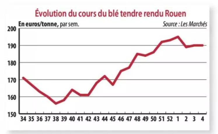 Le blé meunier de qualité recherchéLe blé qui avait vivement progressé sur Euronext accuse un repli de 2 euros, de même que sur le marché physique en revenant à 192 euros, rendu Rouen. Le blé meunier de qualité est recherché pour répondre aux cahiers des charges des importateurs. Sur le marché intérieur, le blé fourrager se trouve en concurrence avec le maïs, plus attractif financièrement pour les fabricants d'aliments du bétail, mais les problèmes de qualité les freinent dans leurs incorporations de maïs et ce n'est pas vers l'orge, à un prix départ de 165 euros, qu'ils se reporteront.