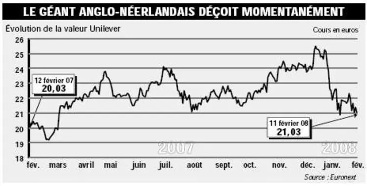 Exception faite des divers coûts de restructuration liés à un périmètre en évolution constante, Unilever a bouclé une année 2007 correcte, avec des ventes en hausse de 1% à 40,2 Md Eur. Au cours des 12 derniers mois, la multinationale a continué de rationaliser son portefeuille, en ne cherchant à conserver que les marques ayant un potentiel international. Ainsi, Boursin, très franco-français, a été cédé au groupe Bel récemment. Ce mouvement pourrait préfigurer un désengagement plus important des marques alimentaires européennes, les noms d’Alsa et de Maille-Amora étant également cités. En novembre, ce sont les marques de sauces et marinades américaines Lawry's et Adolph's qui ont été vendues à McCormick & Company. Au rayon des acquisitions, Unilever a mis la main sur le fabricant russe de crèmes glacées Inmarko, et a étendu au niveau mondial son entreprise commune de vente et de distribution du thé glacé Lipton avec Pepsico. Mais les cessions des années précédentes ont généré d'importants coûts de restructuration, avec une dépense nette de 569 M Eur sur l'exercice précédent. Ce montant handicape le profit opérationnel d'Unilever, qui chute de 3% à 5,2 Md Eur. Les marges ont suivi le même chemin sur les zones Europe et Amériques tandis qu'en bas de bilan, le profit net incluant les éléments exceptionnels perd 18% (il s'affiche néanmoins en hausse de 10% à 4 Md en dehors de ces éléments). Les analystes de la banque UBS ont abaissé leur recommandation « d'achat » à « neutre » avec un objectif de cours à 23,5 euros contre 27 euros précédemment. Pour la banque suisse, si la réduction de l'objectif de cours reflète une visibilité réduite, Unilever reste son acteur préféré du secteur du fait d'un très bon accès à l'épargne et d'une très bonne exposition sur les marchés émergents. Selon la banque, il existe une marge pour une bonne surprise quant à ses performances opérationnelles et à la réorganisation de son portefeuille.