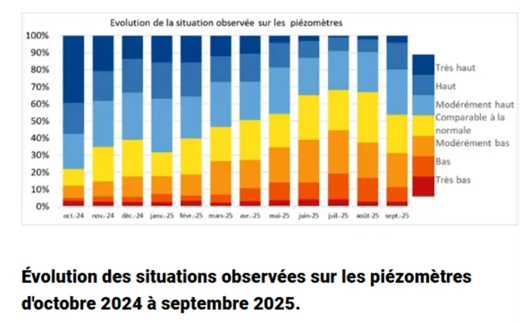 Selon le dernier bulletin du BRGM en date du 1er octobre, l’état des nappes phréatiques s’améliore avec 46 % des points d’observation au-dessus des normales mensuelles, mais moins qu’en 2024 (73 %).