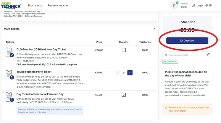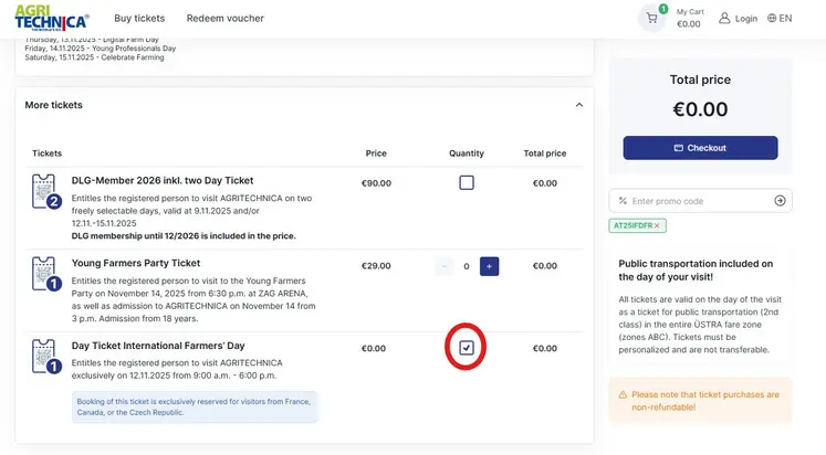 Descendre en bas de la page et cochez la case Day Ticket International Farmers'Day.