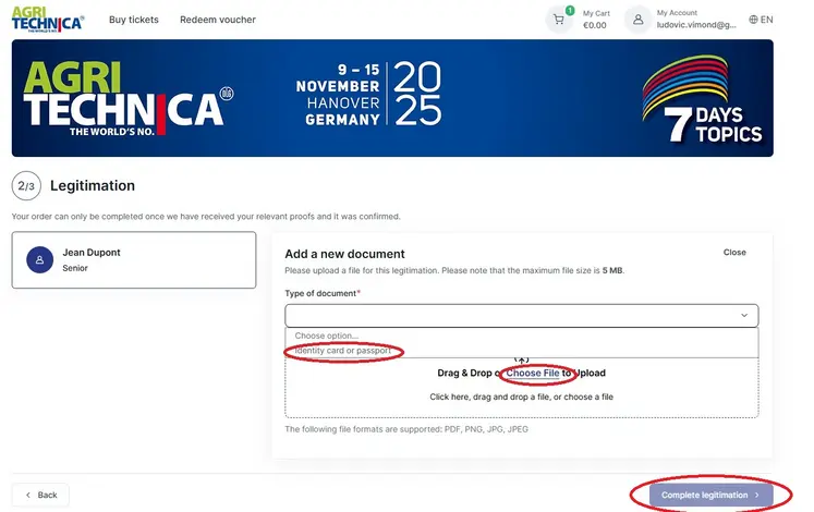 Sélectionnez Identity card or passeport. Puis cliquez sur Choose File et chargez votre photo de votre carte d'identité ou de votre passeport. Une fois chargée, cliquez sur Complete legitimation.