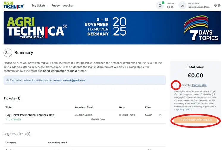 Cochez la case I accept the Terms of Use, puis cliquez sur Send legitimation request.
