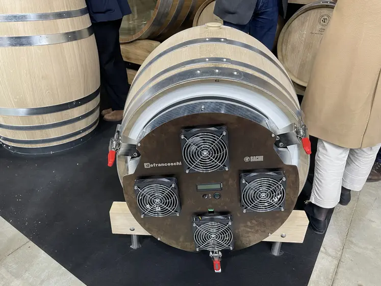 À travers sa filiale Defranceschi, Sacmi présentait lors du Viteff un prototype d’échangeur thermique pour les barriques montées avec un fond en céramique. Cet outil fonctionne grâce à l’effet Pelletier et permet de créer aussi bien du chaud que du froid. L’échangeur, alimenté en 24 V, dialogue avec une sonde de température à l’intérieur de la barrique. Ainsi, plus besoin de canne chauffante ou de régulation dans le chai entier. Cette technologie n’est pas utilisable sur un fond classique, le bois étant trop mauvais conducteur thermique.